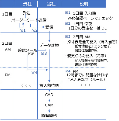 このため翌朝(概ね10:00位まで)には、確認の仕様書をお送りしますので、12:00までにご確認ください。